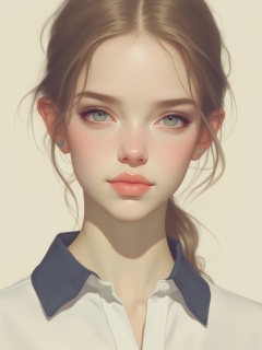 OBxiaoxiang,This is a highly detailed digital painting of a young woman with fair skin and striking blue-green eyes. She has a delicate, almost ethereal appearance with a symmetrical face and soft, smooth skin. Her lips are full and naturally pink, and she has a light blush on her cheeks, enhancing her youthful look. Her hair is a light brown, pulled back loosely with some strands framing her face. She wears a white button-down shirt with a dark blue collar, which stands out against her pale skin and adds a touch of contrast. The background is a soft, muted beige, allowing the subject to be the focal point. The painting style is realistic with a slight impressionistic touch, evident in the soft blending of colors and the delicate brushstrokes that create a sense of depth and texture. The overall mood of the image is serene and contemplative, with a gentle, almost dreamy atmosphere.