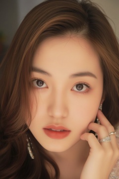 1girl, solo, looking at viewer, jewelry, parted lips, teeth, black eyes, lips, ring, portrait, realistic