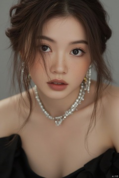 1girl, solo, looking at viewer, brown hair, black hair, dress, bare shoulders, jewelry, upper body, earrings, parted lips, grey background, necklace, black eyes, lips, freckles, realistic, pearl necklace
