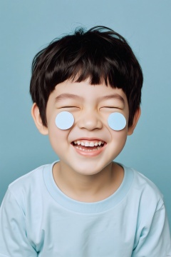Photograph, young boy with short dark hair, wearing a light blue t-shirt, smiling with eyes closed, two white circles on his cheeks, soft blue background, playful and cheerful expression, natural light, playful mood.