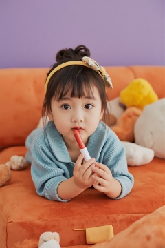Photograph, young child lying on an orange couch, wearing a blue sweater and a yellow headband with a bow, holding a red lipstick to her lips, purple wall in the background, soft toys scattered around, cozy and playful atmosphere.