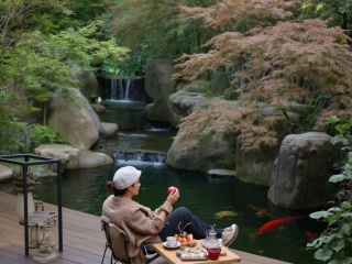 yard,a woman is seated on a chair facing a pond. She is wearing a white cap,a brown long-sleeved shirt,and black pants. Her hair is tied back in a ponytail,and she is holding a red apple in her right hand. Her left hand is resting on her hip,while her left hand rests on her right wrist. A teapot,a plate,and a tray of fruit are placed on the table in front of her. The table is placed on a wooden deck,with a black metal frame around it. Two goldfish can be seen swimming in the pond. The pond is surrounded by large gray rocks,and there is a waterfall in the middle of the image. To the left of the woman,there are green plants and trees.,(Fish pond:1.05),