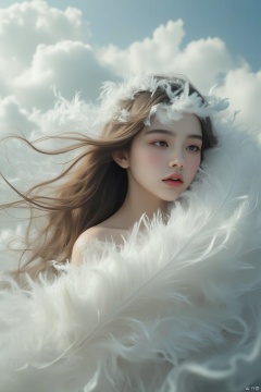 A girl wrapped in a massive white feather, amidst a sea of clouds with detailed textures, featuring exceptionally long hair and an atmospheric feel. The image captures the essence of a dreamy scene where the girl is embraced by nature's tender touch, full body shot, high quality, high-resolution picture.