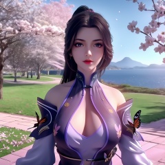 <lora:779-DA-绝世战魂-楚云:0.8>, (,1girl, ,best quality, ),looking at viewer,  ultra detailed background,ultra realistic 8k cg,ultra detailed 8k cg,masterpiece,upper body,  (( , )),, ,science fiction,mole, ultra realistic 8k cg, ,    ,outdoors, sun,sunlight, cherry blossoms,      (cleavage),,  (), butterfly,