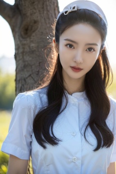 (最高的图像质量,杰作,超高:1.4),1girl,solo,black hair,long hair,realistic,looking at viewer,tree,nurse,outdoors,black eyes,day,dress,short sleeves,lips,sky,brown eyes,((upper_body)),,<lora:jinchen:1>