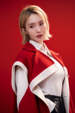 Outdoor scenery,snow view,Snow Mountain,girl,red wool coat,pretty face,short hair,blonde hair,(photo reality:1.3),Edge lighting,(high detail skin:1.2),8K Ultra HD,high quality,high resolution,the best ratio of four fingers and a thumb,(photo reality:1.3),wearing a red coat,white shirt inside,big chest,solid color background,solid red background,advanced feeling,texture full,1 girl,Xiqing,HSZT,Xiaxue,dongy,a girl,magic eyes,black 8d smooth stockings,1girl,sd_mai,xiqing,tm,((poakl flower style)),((poakl)),(()),<lora:jinchen22>