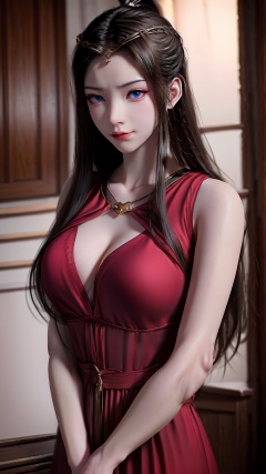 1girl,long hair,black hair,red dress,dress,looking at viewer,solo,blue eyes,breasts,weapon,sleeveless,<lora:Gloss_Tweaker_V2:0.6>,<lora:粉色妆容强度调节滤镜:0.5>,huge filesize,reservoir,upper_body,<lora:girl solo yuanyao_20240908025103:0.8>,