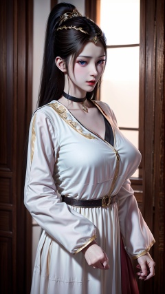 1girl,solo,long hair,black hair,dress,white dress,looking at viewer,blue eyes,hair ornament,indoors,long sleeves,curtains,realistic,choker,closed mouth,lips,standing,ponytail,<lora:Gloss_Tweaker_V2:0.6>,<lora:粉色妆容强度调节滤镜:0.5>,huge filesize,reservoir,<lora:girl solo yuanyao_20240908025103:0.8>,