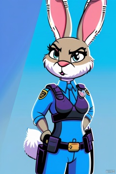 A Coki Rabbit policewoman stands confidently indoors, wearing a blue shirt and matching pants, with a utility belt and shin guards around her legs. Her long sleeves are fingerless gloves, and she holds rabbit ears in one hand. Her purple eyes sparkle as she smiles, her closed mouth forming a determined line. Her black footwear features a small badge on the toe. She looks to the side, her gun holster visible at her hip. A blue border frames the image, with a hint of furry texture on her uniform and vest. The policewoman's flat chest is adorned with a utility belt pouch and a handgun, giving her a strong and capable presence.