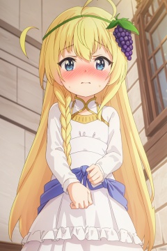 1girl,(loli:1.5), solo,(ahoge:1.4) ,long hair,hair band,Long flowing hair, looking at viewer ,, blue eyes, blonde hair ,palace,hair ornament ,long sleeves, white dress,braid frills food , grapes,index finger raised,(Blushing:1.3),(shy:1.3),,in bed,standing,Angry,reach out, ,(from below:1.2)