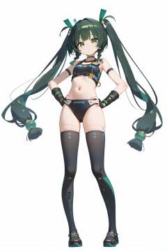 score_9, score_8_up, score_7_up, score_anime, nai3, <lora:YLI 0.1v:0.5>, <lora:style1:0.5>, 8k, best quality, masterpiece, (ultra-detailed), (white background,simple background), solo, (hands on hip:1.1), (full body:1.1), looking at viewer, <lora:qinyi-pony-Tanger:0.8>,qinyi, 1girl, solo, green hair, green eyes, twintails, navel, long hair, bangs, swimsuit, navel, twintails, thighhighs, black hair, bikini,