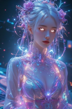 holographic,holographic fabric,1girl,solo,a woman in a dress with a futuristic design on it's chest and arms,white hair,china_dress,purple wedding dress,(complex lace:1.1),upper_body,cyberpunk,pale_skin,cinematic photo official art,unity 8k wallpaper,ultra detailed,aesthetic,masterpiece,best quality,photorealistic,purple rose,tangle,entangle,chinese woman,Glowing eyes,tears,Golden eyeshadows,ecstasy of flower,dynamic angle,(the most beautiful form of chaos:1.2),elegant,a brutalist designed,Gradient colours,(romanticism:1.1),film,professional,skin detail realistic,Shimmering Crysta,looking at viewer,(profile:1.2),(holographic:1.2),(transparent raincoat:1.3),holographic fabric,translucent glass,holographic structure,glowing,clear glass,dress,big breasts,cleavage,slender,(flower sea:1.5), bra, translucent clothes,large breasts, cleavage
