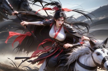 1girl solo long hair black hair holding weapon japanese clothes holding weapon armor headband polearm spear realistic riding horse horseback riding