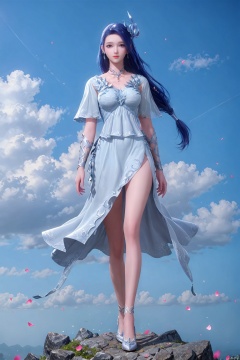 score_9,score_8_up,score_7_up,AY,1girl, solo, long hair, breasts, blue eyes, black hair, hair ornament, dress, jewelry, blue hair, standing, earrings, sky, day, cloud, white dress, blue sky, petals, bare legs, low-tied long hair, falling petals
