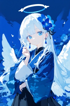 Elite,1girl, solo, long hair, bangs, blue eyes, skirt, hair ornament, long sleeves, flower, white hair, earrings, wings, hand up, hair flower, wide sleeves, black skirt, halo, blue theme
