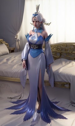3D,masterpiece,(best quality),(makeup),official art, extremely detailed cg 8k wallpaper,((crystalstexture skin)), (extremely delicate and beautiful),(highly detailed),(face),(collar),tassel,,(wide_sleeves),,(tiara),(ribbon),(headpiece),(1girl), (solo), (jewelry), (earrings),(white_hair),(long_hair),(hair_ornament),(handwear),(breasts),(standing),((full_body,whole_body)),(long_legs),(off-shoulder_dress),(closed_mouth),(long_skirt),(chinese_clothes),(dress),,(multicolored_clothes),(multicolored_dress),(shiny_clothes),(city,indoor,bed),(gown),((looking_at_viewer)),((Facing the camera)),(shoes),(high_heels),, <lora:hipoly3DModelLora_v10:0.3>