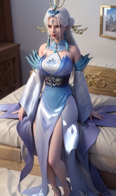 3D,masterpiece,(best quality),(makeup),official art, extremely detailed cg 8k wallpaper,((crystalstexture skin)), (extremely delicate and beautiful),(highly detailed),(face),(collar),tassel,,(wide_sleeves),,(tiara),(ribbon),(headpiece),(1girl), (solo), (jewelry), (earrings),(white_hair),(long_hair),(hair_ornament),(handwear),(breasts),(sitting),((full_body,whole_body)),(long_legs),(off-shoulder_dress),(closed_mouth),(long_skirt),(chinese_clothes),(dress),,(multicolored_clothes),(multicolored_dress),(shiny_clothes),(city,indoor,bed),(gown),((looking_at_viewer)),((Facing the camera)),(shoes),(high_heels),, <lora:hipoly3DModelLora_v10:0.3>