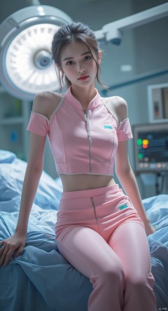 photo,Ultra-realistic,1girl,A shy smile,chinese hanfu,Bare shoulder, operating room,quiet,Cheerfulness,(in surgery), medium breasts, pink nurse uniform, kneeling,