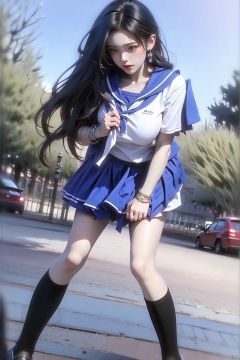 1girl solo skirt school uniform serafuku socks bracelet legs kneehighs knife,风,吹起裙子