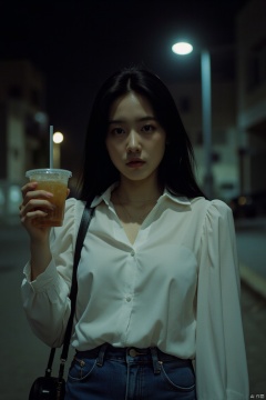 The image is a portrait of a young woman standing on a street at night. She is holding a drink in her left hand and a handbag in her right hand. The woman has long dark hair and is wearing a white blouse and blue jeans. She has a serious expression on her face and is looking directly at the camera. In the background, there are buildings and a street lamp. The overall mood of the image is dark and mysterious.