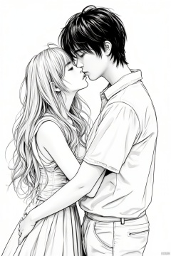 Black and white manga style, Japanese manga style, depicting a scene of a girl and a boy kissing