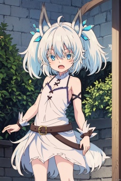 1girl,loli,solo looking at viewer short hair open mouth blue eyes animal ears bare shoulders twintails ahoge fang fox ears,standing