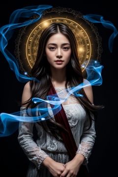 Clairvoyant with long black hair flowing to reveal a visionary spirit, floating magical symbols surround her, enchanting chant sound waves visualized encapsulating her, ancient wisdom aura radiating, shadows leaning into the composition, digital painting, ultra-realistic, dreamy soft focus, ultra fine, dramatic lighting, cinematic quality, reduced saturation.