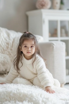 A girl is sitting on a fluffy white blanket. My eyes are red, and behind me is a white sofa with a white blanket on top. On the right side of the sofa is a white framed window. There are two decorations on the top of the window.