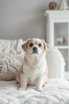 A dog is sitting on a fluffy white blanket. My eyes are red, and behind me is a white sofa with a white blanket on top. On the right side of the sofa is a white framed window. There are two decorations on the top of the window.