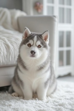 A Husky sits on a fluffy white blanket. My eyes are red, and behind me is a white sofa with a white blanket on top. On the right side of the sofa is a white framed window. There are two decorations on the top of the window.