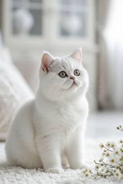 Its front paws rest on the carpet. On her right is a small cluster of white flowers. Blurred background