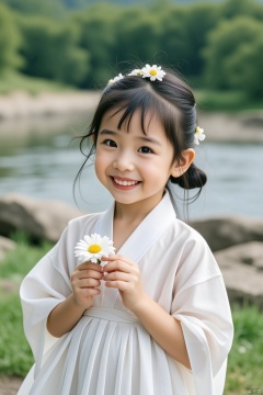 1girl, solo, outdoors, river, flower, hair ornament, smile, hair flower, water, black hair, day, looking at viewer, white flower, korean clothes, blurry, short sleeves, realistic, black eyes, grass, holding, blurry background, teeth, rock