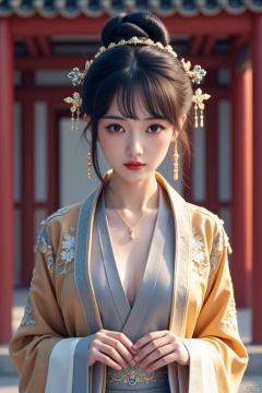1girl, solo, jewelry, earrings, black hair, hair ornament, looking at viewer, blurry background, black eyes, upper body, chinese clothes, blurry, realistic, dress, architecture