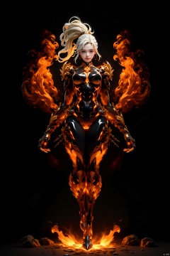 1girl, solo, looking at viewer, bodysuit, fire, long hair, standing, full body, breasts, ponytail, thigh gap, lips, black background, glowing, floating, white hair, blonde hair, armor, earrings, molten rock, rock, medium breasts