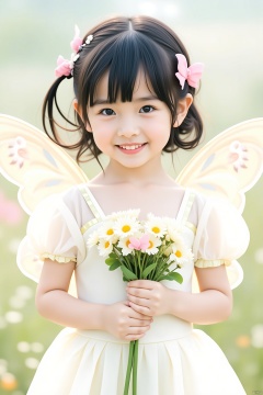 1girl, flower, wings, solo, dress, fairy, black hair, fairy wings, hair ornament, holding, holding flower, blurry background, blurry, hair flower, smile, white dress, looking at viewer, bouquet, short sleeves, puffy sleeves, short hair, butterfly wings, puffy short sleeves, holding bouquet