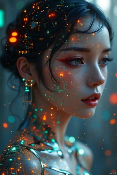 Chinese portrait, Chinese girl, a charming Chinese woman, portrait science fiction photo, direct view, close-up, half body, 135mm, aperture 1.4, wearing a mechanical dress, the whole body is projected by the circuit board to create light interaction with the skin, projected space circuit matrix , circuit style image, a large number of extremely small circuit symbols superimposed layer by layer, the circuit is completely random, forming a full-screen matrix, depth of field circuit blur effect.