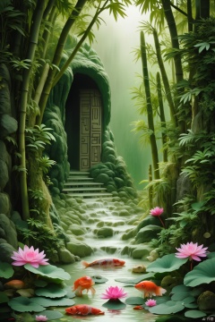 The moon cave door is open, green bamboos are swaying gently, and in the Chinese-style courtyard, there are rockeries, flowing water, and fish playing among the lotus leaves, showing a simple and elegant style.