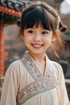 1girl, solo, smile, chinese clothes, architecture, realistic, east asian architecture, looking at viewer, black hair, upper body, bangs, black eyes, hair bun, hair ornament, lips, dress, brown hair, teeth, outdoors