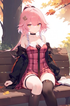 1girl, solo, long hair, breasts, looking at viewer, blush, bangs, pink hair,yellow eyes, hair ornament, long sleeves, dress, holding, cleavage, hair between eyes, bare shoulders, medium breasts, sitting, closed mouth, collarbone, braid, open clothes, day, hairclip, pink eyes, off shoulder, twin braids, tree, book, plaid, window, sleeveless dress, leaf, sunlight, cardigan, pink dress, hair over shoulder, holding book, knee up, open book, bench, autumn leaves, open cardigan, maple leaf, autumn, falling leaves, plaid dress, ginkgo leaf,black thighhighs,ponytail,thigh strap,red single glove,changli, detached sleeves,loli,Artist:ask (askzy),Artist:chen bin,