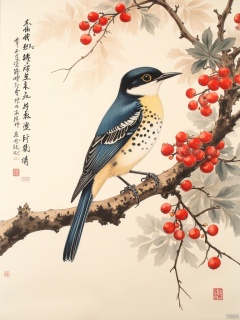 OBguofeng,This image is a highly detailed, realistic watercolor painting of a bird perched on a tree branch. The bird, likely a species of warbler, has a striking appearance with a blue back, wings, and tail, contrasting with a white underbelly adorned with black spots. Its head is black with a distinctive white patch on the forehead, and it has a long, pointed beak. The bird's eyes are large and black, giving it an alert expression. The tree branch it is perched on is brown and textured with a rough, bark-like surface. It is adorned with clusters of small, bright red berries, adding a pop of color to the otherwise muted tones of the painting. The background is a soft, cream-colored wash that subtly highlights the bird and branch, making them the focal points. On the left side of the image, there is a vertical column of Chinese calligraphy in black ink, adding a cultural and artistic element to the composition. The brushstrokes in the calligraphy are delicate and flowing, typical of traditional Chinese art. The overall style of the painting is meticulous and detailed, capturing the natural beauty of the bird and its surroundings with great precision.