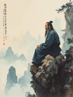 OBguofeng,This is a digital painting depicting an elderly man with a contemplative expression, seated on a rocky outcrop overlooking a misty mountain landscape. The man has a long, flowing beard and is dressed in traditional Chinese attire, characterized by a dark blue, long-sleeved robe with a slightly loose fit. His hair is styled in a topknot, and he appears to be in deep thought, with his hands resting on his lap. The background is a serene, ethereal scene of mist-shrouded mountains and distant, partially obscured peaks. The mist is rendered in soft, subtle shades of blue and gray, creating a dreamy, almost mystical atmosphere. The rocky outcrop he sits on is detailed with rough textures and varying shades of brown, indicating a rugged, natural environment. To the left of the man, there is a vertical scroll with traditional Chinese calligraphy, written in black ink with small red seals at the bottom. The calligraphy adds a cultural and symbolic element to the scene. The overall style of the painting is realistic with a touch of traditional Chinese ink painting techniques, emphasizing the tranquility and introspection of the subject.