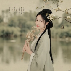 Photograph serene woman in traditional Chinese hanfu holding a bouquet of dried flowers standing by a tranquil lake surrounded by lush greenery soft natural light calm and peaceful mood long black hair gentle expression delicate floral background ancient Chinese aesthetic gentle and contemplative atmosphere., Photograph serene woman in traditional Chinese hanfu holding a bouquet of dried flowers standing by a tranquil lake surrounded by lush greenery soft natural light calm and peaceful mood long black hair gentle expression delicate floral background ancient Chinese aesthetic gentle and contemplative atmosphere., macp style, 1girl, macp_background, hair bun, solo, hanfu, long hair, looking at viewer, smile, black hair, long sleeves, holding, closed mouth, upper body, black eyes, single hair bun, branch, holding flower, from side