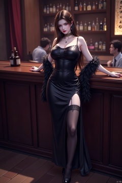 8K image.1girl, solo, long hair, breasts, looking at viewer, blue eyes, large breasts, brown hair, thighhighs, dress, bare shoulders, jewelry, standing, full body, pantyhose, earrings, indoors, black footwear, black dress, high heels, lips, makeup, sleeveless dress, standing on one leg, bottle, side slit, red lips, feather boa, bar \(place\)