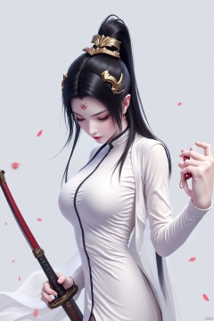 8K image.1girl, solo, long hair, black hair, hair ornament, long sleeves, dress, holding, jewelry, closed mouth, upper body, weapon, earrings, sword, hair bun, holding weapon, white dress, petals, facial mark, holding sword, chinese clothes, forehead mark, falling petals, reverse grip