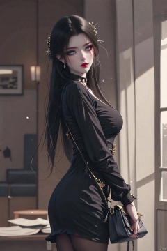 8K image. ((poakl)),1girl, solo, long hair, breasts, looking at viewer, blue eyes, black hair, long sleeves, dress, jewelry, standing, ass, pantyhose, earrings, looking back, indoors, bag, black dress, from side, lips, black pantyhose, makeup, lipstick, handbag, red lips
