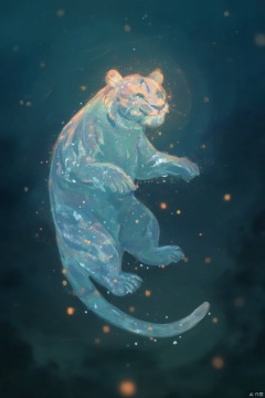 (a giant fantasy ([stool|tiger]) creature), supernatural energy, glowing, small and transparent, releasing a shimmering light, like an underwater light