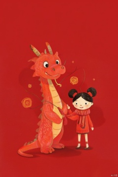 A cute and humanized red Chinese dragon and a Chinese little girl, in Pixar style, both wearing human red sweaters and tying a red woolen scarf around their necks, performing the same congratulatory gesture. The red background is very festive, with Chinese elements, welcoming the new year. 32k