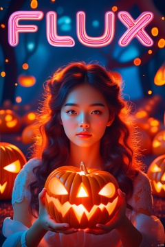 The logo One Thought gleams like a beacon amidst the bustle.FLUX screams the bold, futuristic title across the magazine cover in a swirling, neon-lit font. A cyborg insect's mechanical legs protrude from a curvaceous frame, as if emerging from a portal. In the foreground, a stunning Chinese girl with long, curly brown hair and piercing blue eyes gazes directly at the viewer. Her lips are painted a deep crimson, drawing attention to her full, pouty mouth. She holds a real, glowing jack-o'-lantern in one hand, its orange glow illuminating her porcelain skin. The camera captures her solo figure against a blurred, Halloween-themed background, where ghostly silhouettes of pumpkins dance in the shadows. The 35mm f/2.0 lens creates a shallow depth of field, isolating our subject amidst the eerie ambiance.