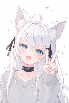 The image is an illustration of a young girl with long white hair and blue eyes. She has two large cat ears on her head, which are attached to her hair with black bows. She is wearing a gray sweater and a black choker necklace. The girl is making a peace sign with her right hand and has a big smile on her face. The background is white with small blue stars scattered around.