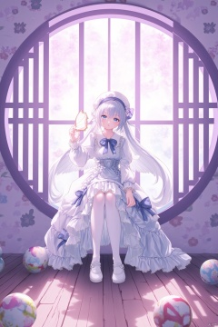 The image is an illustration of a young girl with long white hair and blue eyes sitting on a wooden floor in front of a large circular window. She is wearing a white dress with a blue ribbon tied around her waist and a white hat with a bow on top. The dress has a ruffled skirt and a blue bow on the left side. The girl is holding a white fan in her right hand and is looking off to the side with a peaceful expression on her face. The background is a purple wall with a floral pattern and there are several colorful spheres scattered around the floor. The overall mood of the image is serene and peaceful.